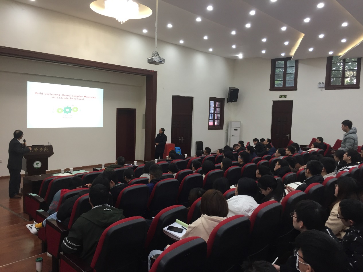 谢作伟院士首先从简单的碳硼烷分子结构讲起,介绍了碳硼烷笼状分子的研究现状和应用。随后,他介绍了课题组发展的过渡金属催化的碳硼烷中硼氢键活化和选择性官能团化的三种方法,他们通过控制实验、中间体捕捉和单晶培养以及计算化学等手段对这些反应的历程进行了深入研究,提出了可能的反应机理。整场报告内容丰富,谢作伟老师讲解思路清晰,由浅入深,形象生动地向我们展示了他们课题组的工作,谢老师系统、深入且具有课题组特色的研究工作给在座的老师和同学以启发,在座的师生全神贯注、兴趣盎然。在随后的自由提问环节,在座师生与谢作伟老师进行了深入地讨论交流,大家都表示获益匪浅。报告在全场师生热烈的掌声中落下了帷幕。