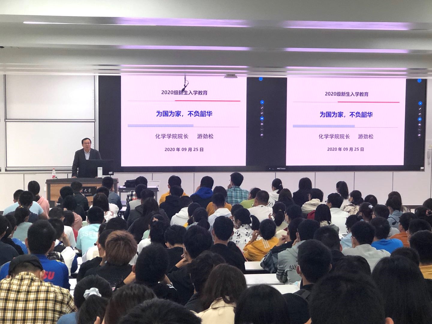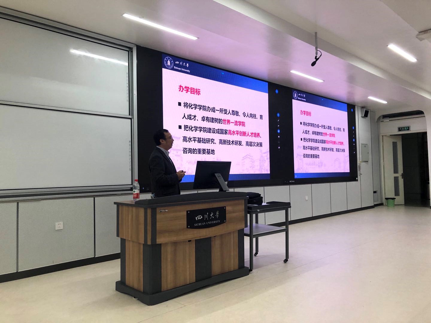 、师资力量、科研成果、学科建设、特色发展以及学院近几年取得的成绩向同学们做了系统全面地介绍,并在讲座中引述知名校友经历及成就引导学生对化学专业的正确认识,从自身奋斗引述到国家命运,告诉同学们“读书大是为了国家,小是为了自己”,鼓励同学们珍惜青春,肩负发展使命,心系国家未来,做栋梁之材。游院长勉励学生们要勤修品德,励志成才,努力为中华民族的伟大复兴做出自己应有的贡献。