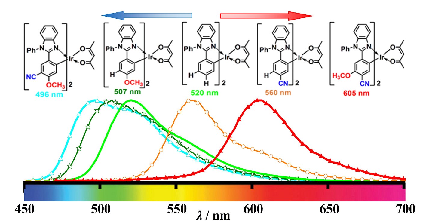 9ã€Yan Jiao, Ming Li, Ning Wang, Tao Lu, Liang Zhou,* Yan Huang, Zhiyun Lu,* Daibing Luo, Xuemei Pu.* A facile color-tuning strategy for constructing a library of Ir(III) complexes with fine-tuned phosphorescence from bluish green to red using a synergetic substituent effect of –OCH3 and –CN at only the C-ring of C^N ligand, J. Mater. Chem. C, 4, 4269-4277, 2016.