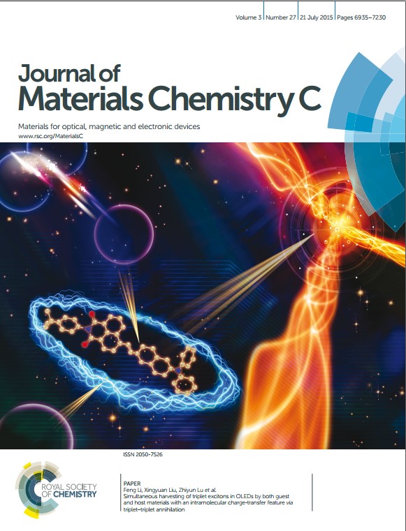 10ã€Xujun Zheng, Qiming Peng, Jie Lin, Yi Wang, Jie Zhou, Yan Jiao, Yuefeng Bai, Yan Huang, Feng Li,* Xingyuan Liu,* Xuemei Pu and Zhiyun Lu,* Simultaneous harvesting of triplet excitons in OLEDs by both guest and host materials with an intramolecular charge-transfer feature via triplet-triplet annihilation, J. Mater. Chem. C, 3, 6970-6978, 2015 (Cover story).
