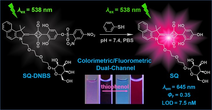 8ã€Li Xiong, Jun Ma, Yan Huang, Zihe Wang, Zhiyun Lu,* Highly Sensitive Squaraine-Based Water-Soluble Far-Red/Near-Infrared Chromofluorogenic Thiophenol Probe, ACS Sensors, 2, 599-605, 2017.