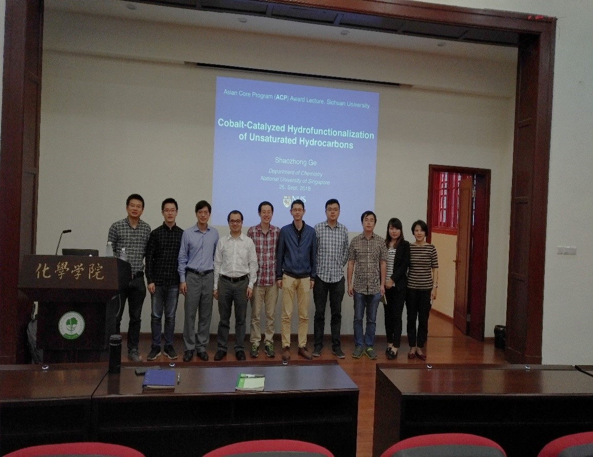 并做了题为“Cobalt-Catalyzed Hydrofunctionalization of Unsaturated Hydrocarbons”的学术报告。报告中,葛少中教授分享了他们在钴催化烯烃的硅氢化反应及其相应的不对称反应的研究进展。葛少中教授的报告内容新颖,讲解思路清晰,深入浅出,激起了在座老师和同学的浓厚兴趣,报告结束后,葛少中教授和现场的老师、同学们进行了深入的讨论和交流。