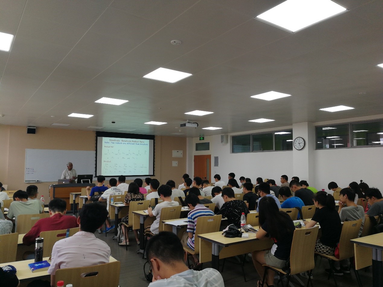 Ramamurthy教授从“光和生活”开始,为同学们讲述了超分子光化学这一新兴学科的发展进程及前景,让同学们了解了什么是光,什么是光化学,以及光化学在生活中的应用,激发了学生的学习兴趣。接下来,教授为同学们讲解了光化学中一些非常实用的基础知识,如:吸收与发射,发射与辐射,电子转移与能量转移等。最后课程以现在超分子光化学的研究成果作结,将同学们带入了学术的殿堂。总的来说,本次“国际课程周”授课十分圆满,从课堂效果来看,同学们发言积极踊跃;从学习成果来看,同学们收获颇丰。