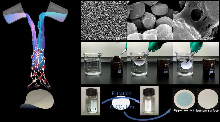 环保高分子材料国家地方联合工程实验室提出将天然大分子海藻酸作为有机粘结剂,原位制备无机物含量高达95%的高韧性自支撑CaCO3膜。该柔性膜中CaCO3以方解石(calcite)形式存在,其表面被海藻酸所覆盖,并在微米CaCO3颗粒间形成大量的凝胶桥,以确保其断裂伸长率达到10%。该材料具有表面超亲水、水下超疏油及自清洁特性,可用于油水混合液分离和乳液分离;此外,由于碳酸钙可与重金属离子发生阳离子交换反应,因此通过直接过滤即可高效去除溶液中的重金属离子。