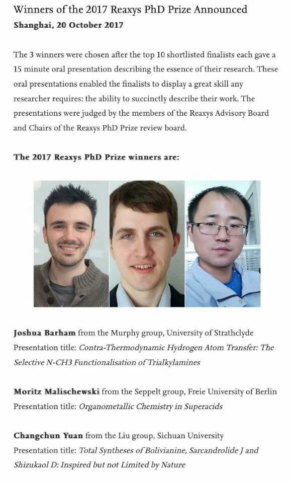 2017届博士毕业生袁长春从约550名申请人中脱颖而出,被宣布为2017年度的Reaxys PhD Prize的三位获奖者之一。袁长春也是该国际奖项设立以来,首位在国内获得博士学位的获奖者。