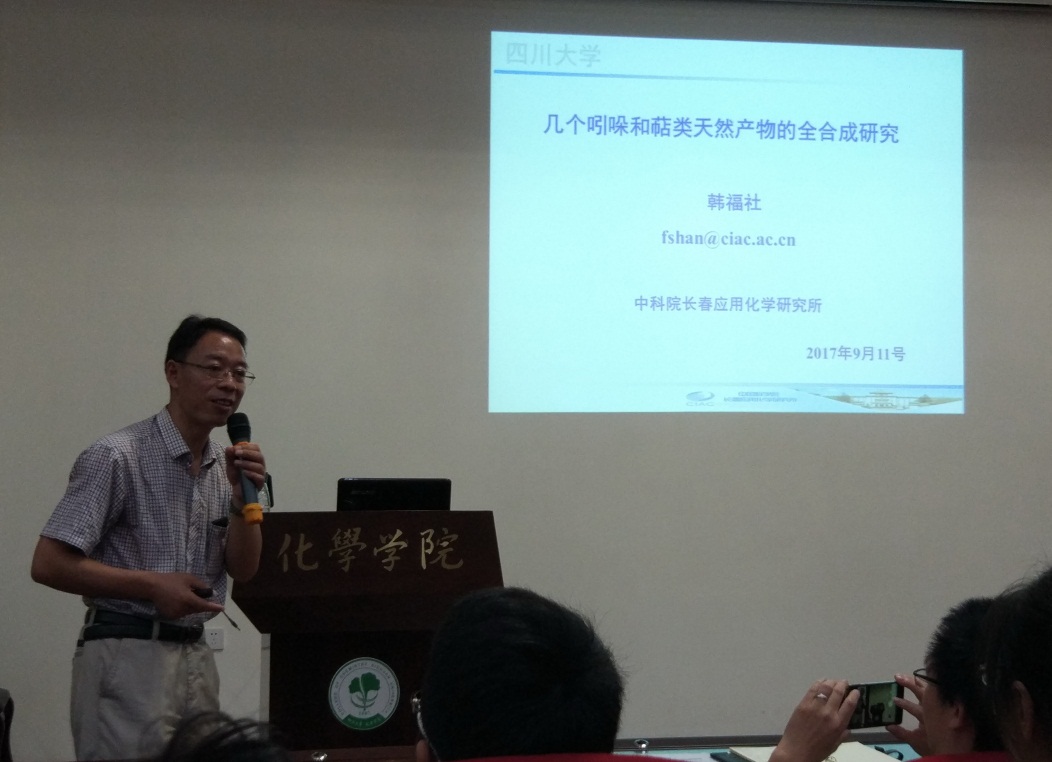 邀请,中国科学院长春应用化学研究所韩福社研究员来访,并作了题为“几个吲哚和萜类生物碱的全合成研究”的学术报告。在化学馆321报告厅,韩福社研究员详细介绍了该课题组采用C-H键活化去对称策略,合成磷中心手性化合物的合成方法学及其在不对称合成中的应用;在发展新颖的季碳构建方法和发现新型环钯催化的高效偶联方法的基础上,完成了几个结构复杂的吲哚类((-)-Mersicarpine和Tronoharine)和萜类(Cyrneine A、 Allocyathin B2、 Hamigeran B和4-Bromohamigeran B)天然产物的高效合成。此次报告会由a漫