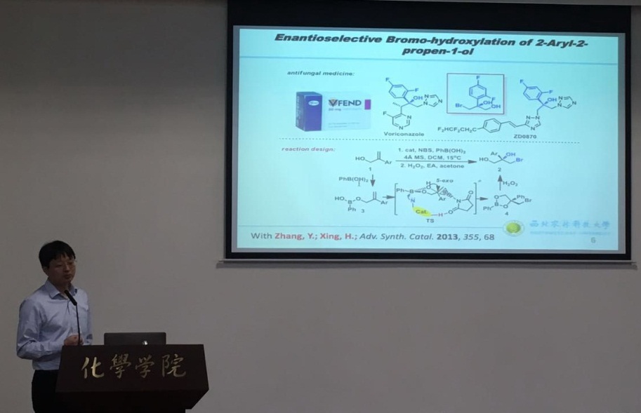 并作学术交流。在化学馆321报告厅,谢卫青教授详细介绍了该课题组发展的手性阴离子相转移催化(Chiral Anion Phase-Transfer Catalysis)不对称卤化反应,该类溴化试剂催化不对称卤化反应条件温和而且手性控制优良;基于该方法学,该课题组构筑了吡咯并吲哚及呋喃并吲哚类骨架并实现了天然产物(-)-chimonantine 和 (-)-conolutinine的高效简洁合成。此次报告会由a漫