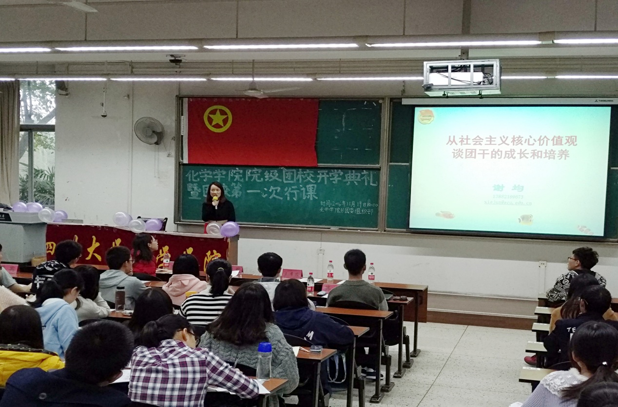 党委副书记谢均老师进行授课。谢均老师本次授课内容为:从社会主义核心价值观谈团干的成长和培养。谢老师在授课中不断插入一些她在工作中的所见所闻,使现场气氛变得更加自由融洽。