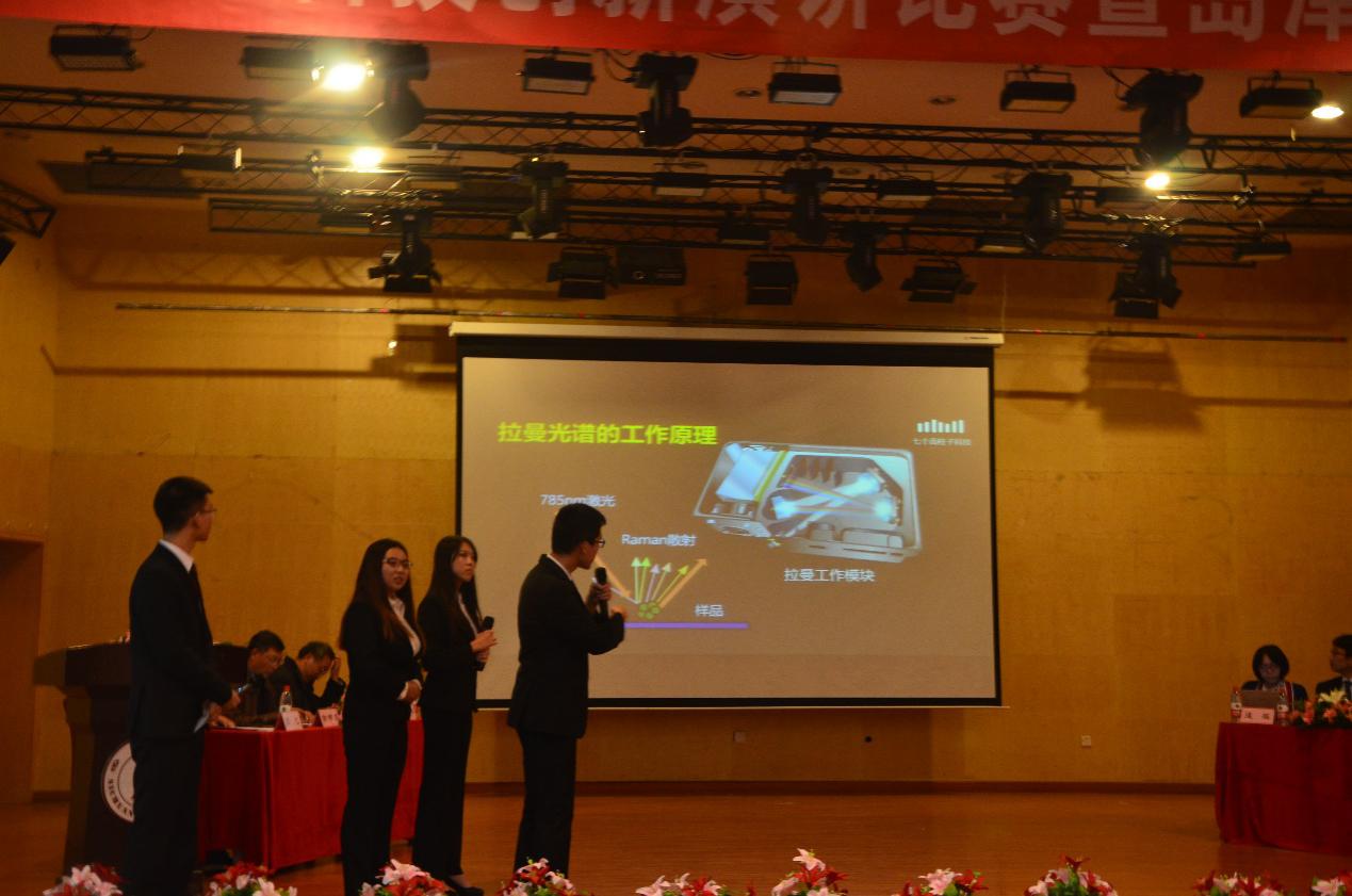 比赛正式开始后,四支参赛队伍轮流上台进行产品介绍:“宝宝说的都队”致力于一款能够及时向父母反馈宝宝排泄情况的智能纸尿裤的研发。“七个高柱子队”为我们介绍了一种叫做“HACK”的智能仪器,希望用这款仪器可以减少广大科研人员“过柱子”的时间。Waker队介绍了运用集成蓝牙的降噪耳机与眼罩,还大众一个良好的睡眠环境。最后“洪荒之力队”告诉我们我们如何方便有效地改善室内空气质量——只需要安装一扇他们特制的多功能窗户。演讲结束后进行了拉票环节,精彩的三句半与小诗歌为比赛增添了浓郁的文学气息。在各个评委的点评后,两支队伍成功晋级,分别是Waker队和洪荒之力队。
