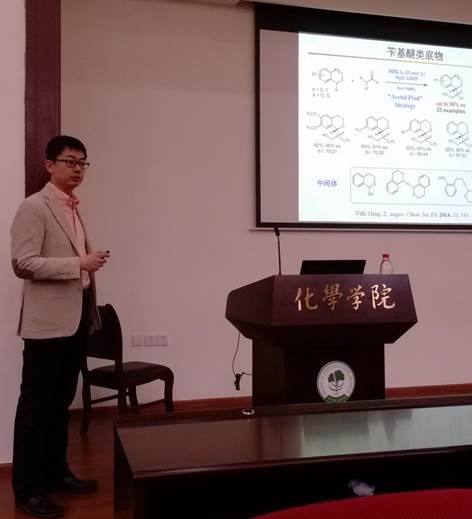 并作学术交流。在化学馆321报告厅,刘磊教授详细讲解了基于氧化策略的不饱和杂环的精准官能化:使用三苯基碳正离子盐为氧化剂,促使杂原子邻位发生氢负离子转移,进而被亲核试剂进攻,得到官能化的不饱和杂环。该反应体系的优点是:无需贵金属催化,反应条件温和。此次报告会由刘波教授主持,a漫