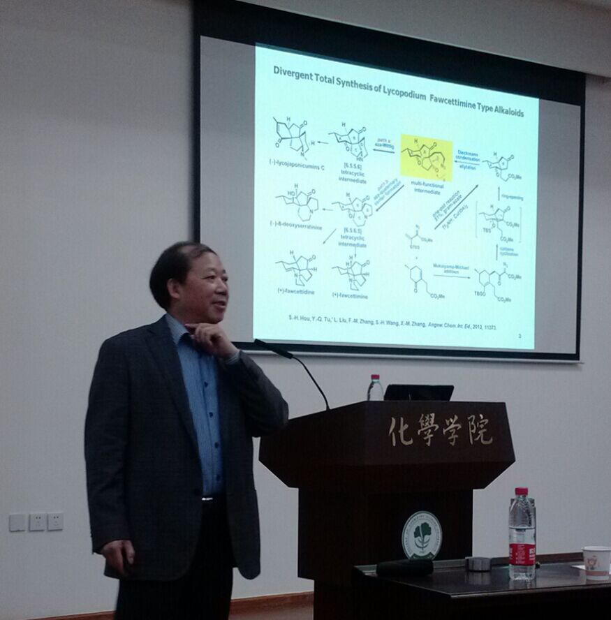 并进行了学术交流。在化学馆321报告厅,涂院士详细讲授了他所领导的课题组的特色研究:将构建手性季碳中心的Semipinacol Rearrangement和Schmidt Rearrangement与复杂天然产物全合成紧密结合。在底物的手性诱导或者手性催化剂作用下,该系列重排反应能够高效、高立体选择性地构建季碳手性中心,特别是螺环手性季碳中心。基于该方法学,涂院士课题组简捷高效地实现了一系列具有多个稠环和多个季碳中心的复杂天然产物的全合成,其中的代表性分子包括(+)-Alopecuridine、(+)-Sieboldine A、(−)-Lycojapodine A 、(-)-Lycojaponicumin C、(-)-8-Deoxyserratinine、(+)Fawcettimine、(+)Fawcettidine、Conidiogenone、Conidiogenol和Conidiogenone B等。此次学术报告会由a漫