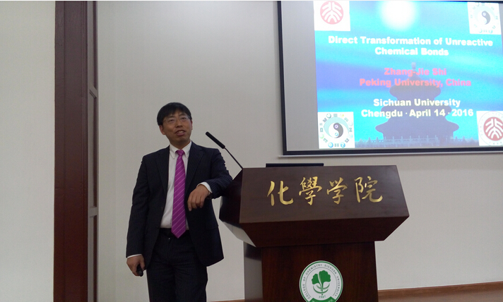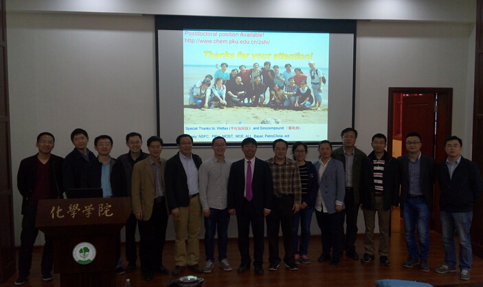 并进行了学术交流。在化学馆321报告厅,施章杰教授做了题为“新一代物质转化途径”的学术报告。报告中,施教授介绍了其课题组在过去十几年中在C-H/C-O键活化领域所做的开创性工作与所取得的丰硕成果。针对C-O键活化领域,施教授讲述了酯类C-O键的选择性活化以及基于“相互活化”理念实现的酚类惰性C-O键的直接偶联反应。此外,施教授从化学公司提供的错误原料开始,详细讲述了该课题组在惰性C-H键活化领域的发展史,针对该领域存的重要挑战和科学问题,从导向的邻位碳氢键卤化反应到芳基化反应,从有机金属试剂到普通芳环参与的氧化偶联,从贵过渡金属到普通金属甚至无过渡金属参与的C-H键转化反应,从偶联反应到对醛酮亚胺的加成反应。施教授报告内容丰富,讲解深入浅出,幽默风趣,妙语连珠,并且以实验室真实的一些故事鼓励在场的每位同学,在未知领域要敢想敢做,勇于创新,严谨细致,态度决定一切(不要以证明导师想法是错误的为动机),设定较高目标,将自己个人的发展与实验室的长期目标和理想紧密关联,加强和导师的沟通和交流,茁壮成长。