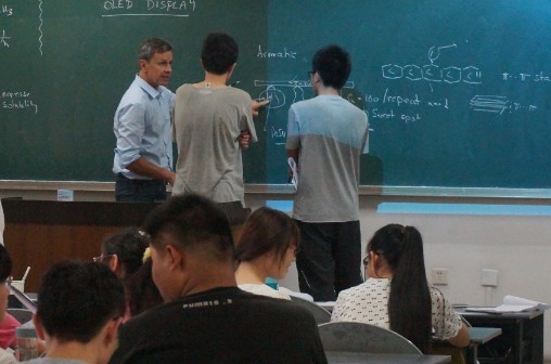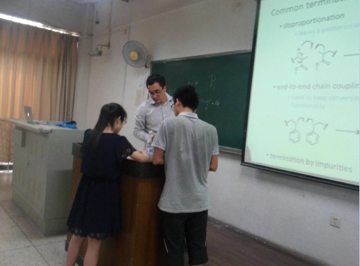 为给我校本科生带来内容和形式上充分的国际化体验,本门课程延续了在加州大学圣巴巴拉分校上课的传统模式,由两位教授共同讲授。两位教授授课内容各有侧重,风格多样,为学生带来多元化的学术交流感受。Bazan教授在课堂上图文并茂地为学生们普及了有机发光二极管,薄膜晶体管,有机太阳能电池等光电半导体材料领域的一些基础知识及基本原理,并展示了自己课题组在相关领域的优秀研究成果;Read教授通过列举生活中的实例让同学们对聚合物产生浓厚的兴趣,接着对聚合物的聚合方式、生长方式和终止进行详细讲解,层层推进。最后分析怎样合成准确的聚合物分子并介绍近年来实验室合成精确定义的聚合物在药物载体方面的应用。