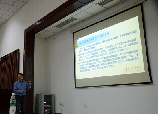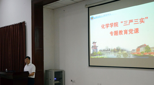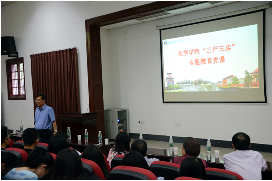 “三严三实”专题教育党课报告会在化学馆一楼报告厅举行。党委书记王智猛做了“践行三严三实,做一名忠诚干净担当的党员干部”的专题教育党课。报告会由余孝其院长主持,校党委书记杨泉明教授、校长助理组织部部长曹萍教授等到报告会现场给予指导。a漫