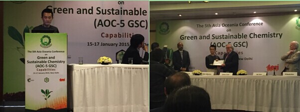 第五届亚洲大洋洲绿色与可持续发展化学大会(The 5th Asia-Oceania Conference on Green and Sustainable Chemistry)于2015年1月15-17日在印度首都新德里召开。本次会议参会人数约250人,其中邀请到了包括Prof. Paul T. Anastas (Yale University, USA), Prof. James Clark (University of York, UK), Dr. John C. Warner (Warner Babcock Institute for Green Chemistry, USA), Dr. David Constable (ACS-GSI, USA)等几十位国际绿色化学领域知名科学家,以及来自11个国家和地区的代表。a漫