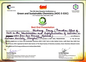 2013级硕士研究生蒋智成(导师:胡常伟老师)在本次会议上做了题为“Promotion Effect of NaCl on the Solubilization and Depolymerization of Cellulose in Water from Raw Biomass Materials”的口头报告,该报告受到了大会专家的好评,并获得大会颁发的“最佳口头报告奖”(Best Oral Presentation,大会选定了共3名)。