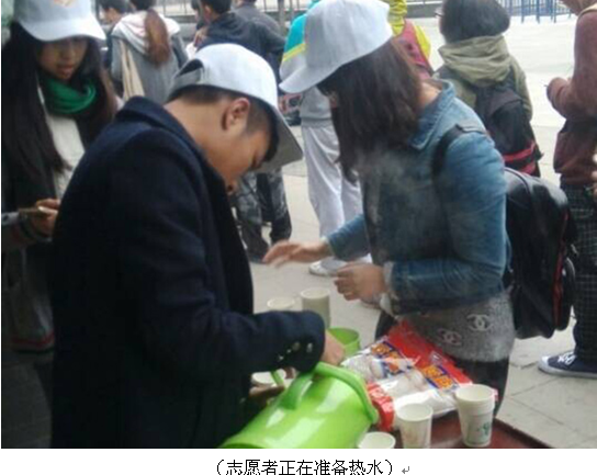 江安校区校车站开展了“一米阳光”之手心送温暖活动志愿活动,为在寒冷的早晨等校车的同学免费提供热水。