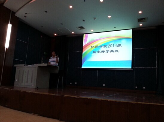 谢均老师主持了本次典礼,向2014级的新同学们介绍了各位老师。首先,王智猛书记致辞,表达了对2014级新同学的热烈欢迎,并且对生活与学习中的诸多细节提出了建议。余孝其教授介绍了a漫