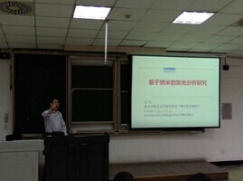 首先吕弋教授根据我们现有的知识点,为我们详尽地解释了题目的含义,接着又以自然界生物的发光现象为切入点以气体分子在材料表面发光为例详细地讲述了其发光的机理。然后,以酒为例,深入浅出地为我们讲述气敏传感和发光传感的工作原理。紧接着,吕教授重点介绍了他所在的实验室的一系列研究成果,最后,他还向我们展示了对纳米的发光分析研究在生活中的广泛应用以及给生活带来的便利,极大的地鼓舞了同学们的研究兴趣。
