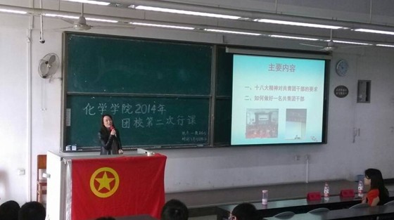 近几年来的进步,同学们感到了作为川大人的骄傲和自豪。接着老师从十八大精神对共青团干部的要求和如何做好一名共青团干部两个大方面展开了深入的讲解。十八大给我们青年学生干部的要求首先是大兴学习之风,学有专长,然后是要与时俱进,踏实敬业,做一个有责任感的青年干部,最后是积极投身实践,求真务实,把远大抱负与实干精神结合,谢书记还鼓励我们参与学术型社团,介绍了由王玉忠,李梦龙等老师带领的化学领域的学科社团,同学们都表现出了非常浓厚的兴趣。