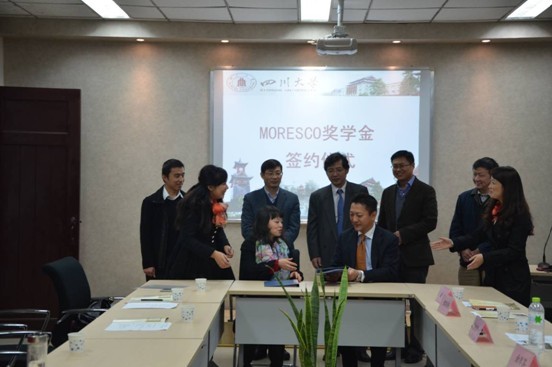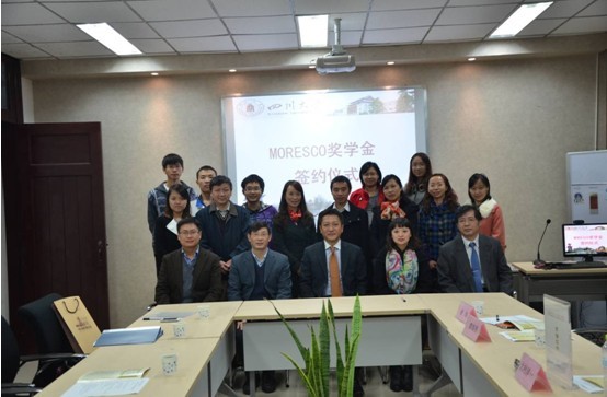 ”MORESCO”奖学金捐赠协议书。接着,廖海燕老师向大村洋一先生和刘英进先生颁发荣誉证书。最后,所有嘉宾、老师和学生代表合影留念。