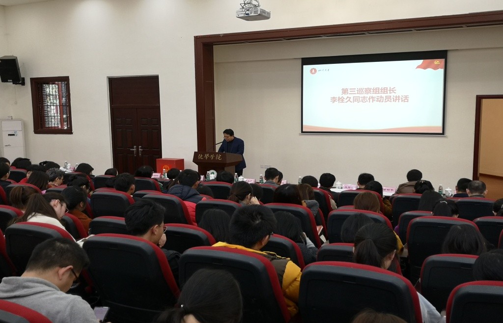 学校党委第三巡察组组长李栓久作动员讲话。校党委巡察办专职副主任李玉峰就学院支持、配合巡察工作提出要求。学院党委书记王智猛作表态发言。院长游劲松主持会议。