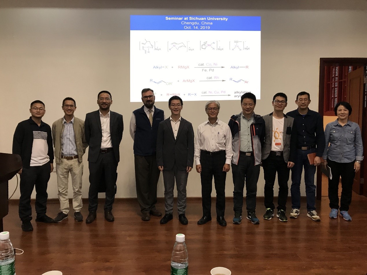 在此次报告中,Kambe教授首先从四大偶联反应出发,引出了以B,Mg,Zn,Ti,Sn等试剂做亲核试剂,通过各种过渡金属催化的不同类型的C(sp2)-C(sp2), C(sp3)-C(sp2), C(sp3)-C(sp3)交叉偶联反应。随后,在该基础上,Kambe教授讲解了他们课题组以Ni, Co, Pd, Rh, Fe与双烯形成的Ate复合物为催化剂,高效构筑C-C键的系统工作。利用该策略,Kambe教授实现了对天然产物和药物分子的修饰,并对反应机理也进行了系统深入的研究。整场报告内容丰富,Kambe教授讲解清晰,由浅入深,形象生动地向我们展示了各种过渡金属Ate复合物催化C-C成键反应在有机合成的应用以及在复杂分子合成中的巨大潜能。在随后的自由提问环节,在座师生与Kambe教授进行了深入地讨论交流,大家获益匪浅。报告在全场师生热烈的掌声中落下了帷幕,结束后部分老师与Kambe教授进行了合影留念。