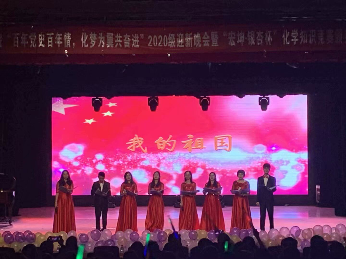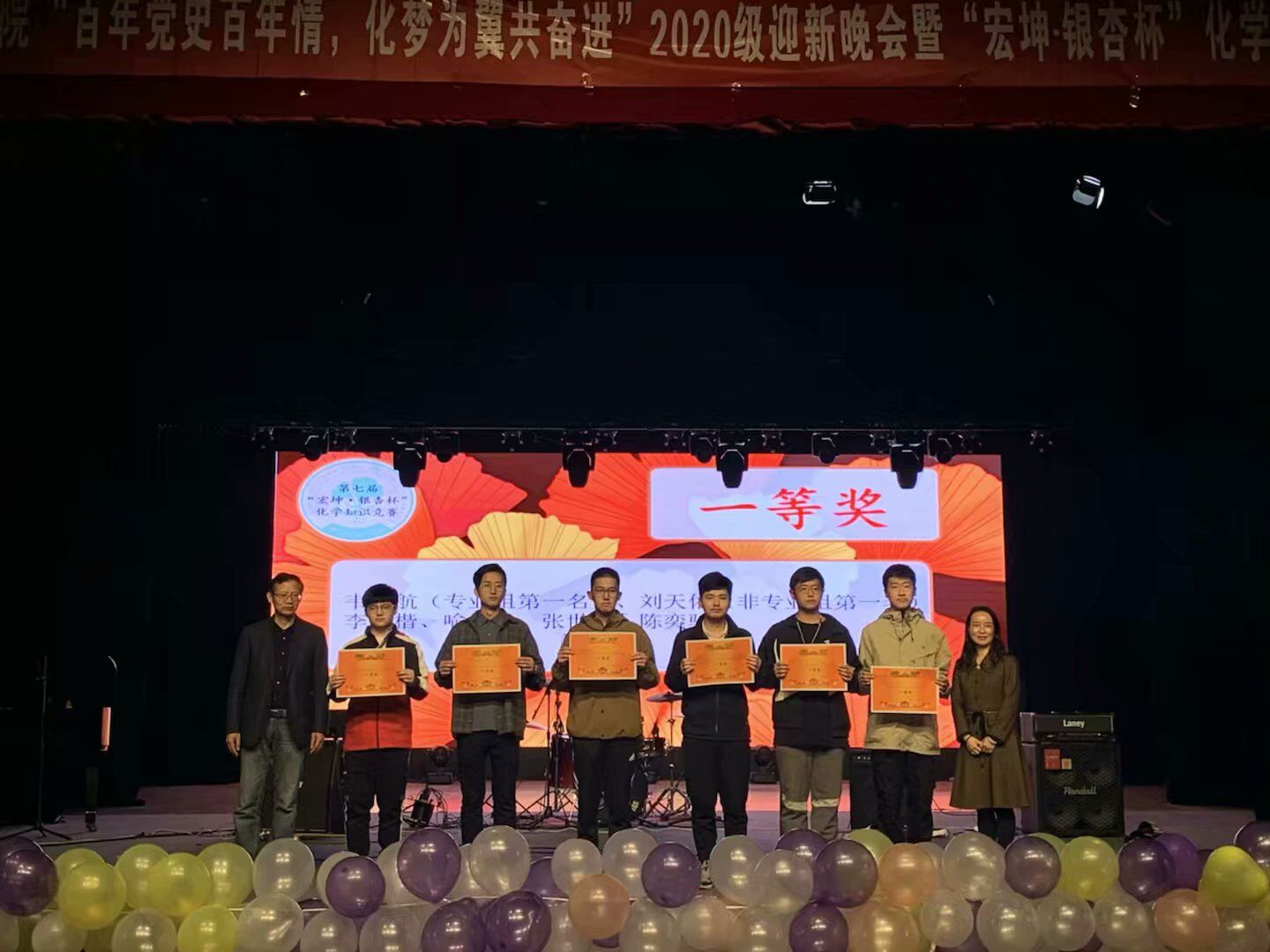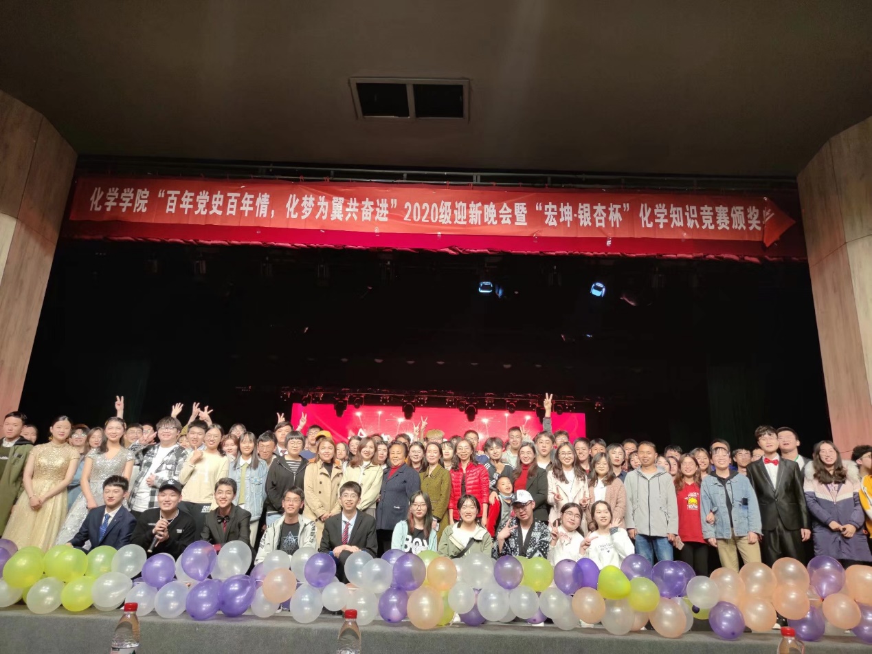 “百年党史百年情,化梦为翼共奋进”2020级迎新晚会暨第七届“宏坤·银杏杯”化学知识竞赛颁奖典礼在江安校区艺术学院小剧场举行。a漫