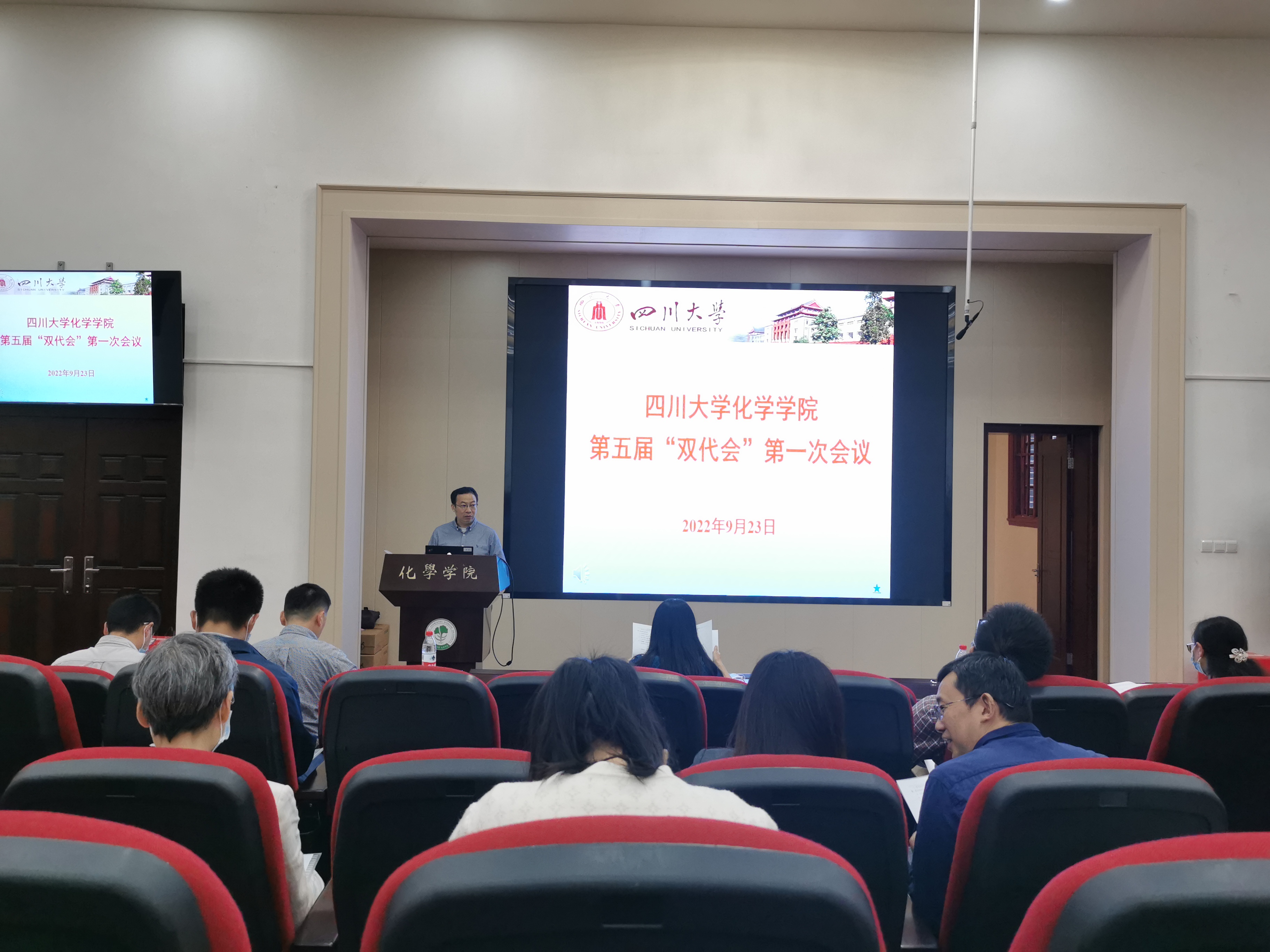 第五届教职工代表大会暨工会代表大会第一次会议在化学馆321报告厅隆重召开。本次大会的主题是“聚焦“双一流”、奋进“十四五”,凝心聚力推进学院高质量内涵发展。学院双代会代表出席本次会议,大会由学院党委书记谢均同志主持,大会执行主席为学院党委副书记肖波同志。