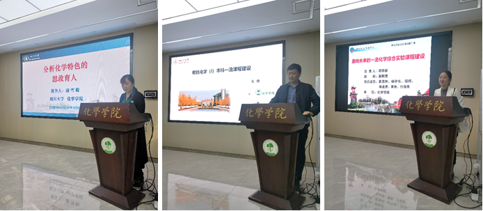 会上,由学院初步评审结题优秀的老师代表分享教改成果。蒲雪梅教授以“‘思政育人’为导向的分析化学课程教学新模式的构建”为题,详细介绍了分析化学特色的思政育人方式,将分析化学专业知识点与思政育人案例有效结合,充分挖掘课程专业特色的思政元素,探索课程思政内容和方式的多样化和专业化。张骥教授带来了主题为“有机化学(I)本科一流课程建设”的教改经验分享,通过“微课矩阵”辅助教学资源建设、结合超星学习通平台的网课建设等方式,将课程知识点融会贯通,让学生了解更多学科发展趋势,提升学生科研热情,培养学生家国情怀。郑学丽副教授讲解了“面向未来的一流化学综合实验课程建设”项目开展情况,将新技术、新理论和新方法引入实验内容,分别从提升教学内容先进性、改进配套教材、建设线上教学资源方面提高学生综合能力、培养学生研究意识和创新思维。