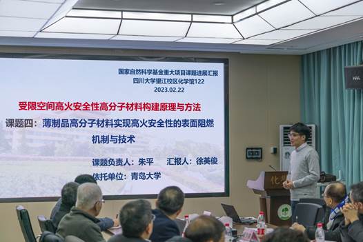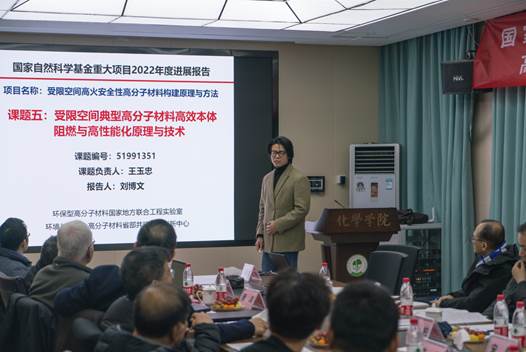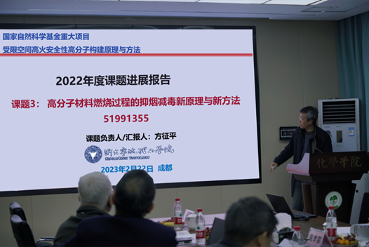 我校褚良银副校长代表学校致欢迎辞,强调火安全材料在国家经济社会发展中的重要地位,并表示学校将继续做好条件支持和服务工作,全力支持重大项目的开展。国家自然科学基金委工材学部马劲处长表示这是项目启动后首次线下进行的会议,肯定了项目组在疫情年度所取得的进展和成果,并提出在后续的工作中各单位间加强交流,明确各课题的任务和内容,做好中期评估和检查的准备。项目负责人王玉忠院士介绍了项目整体执行情况,各课题详细汇报了2022年度取得的研究进展与成果。项目学术指导组专家杨柏教授和戴李宗教授与项目组成员进行了充分、深入的讨论交流,并对项目与课题的进展情况给予了肯定,针对存在的问题提出了具体的意见和建议,为下一阶段的工作提供了实质性的指导意见和建议。