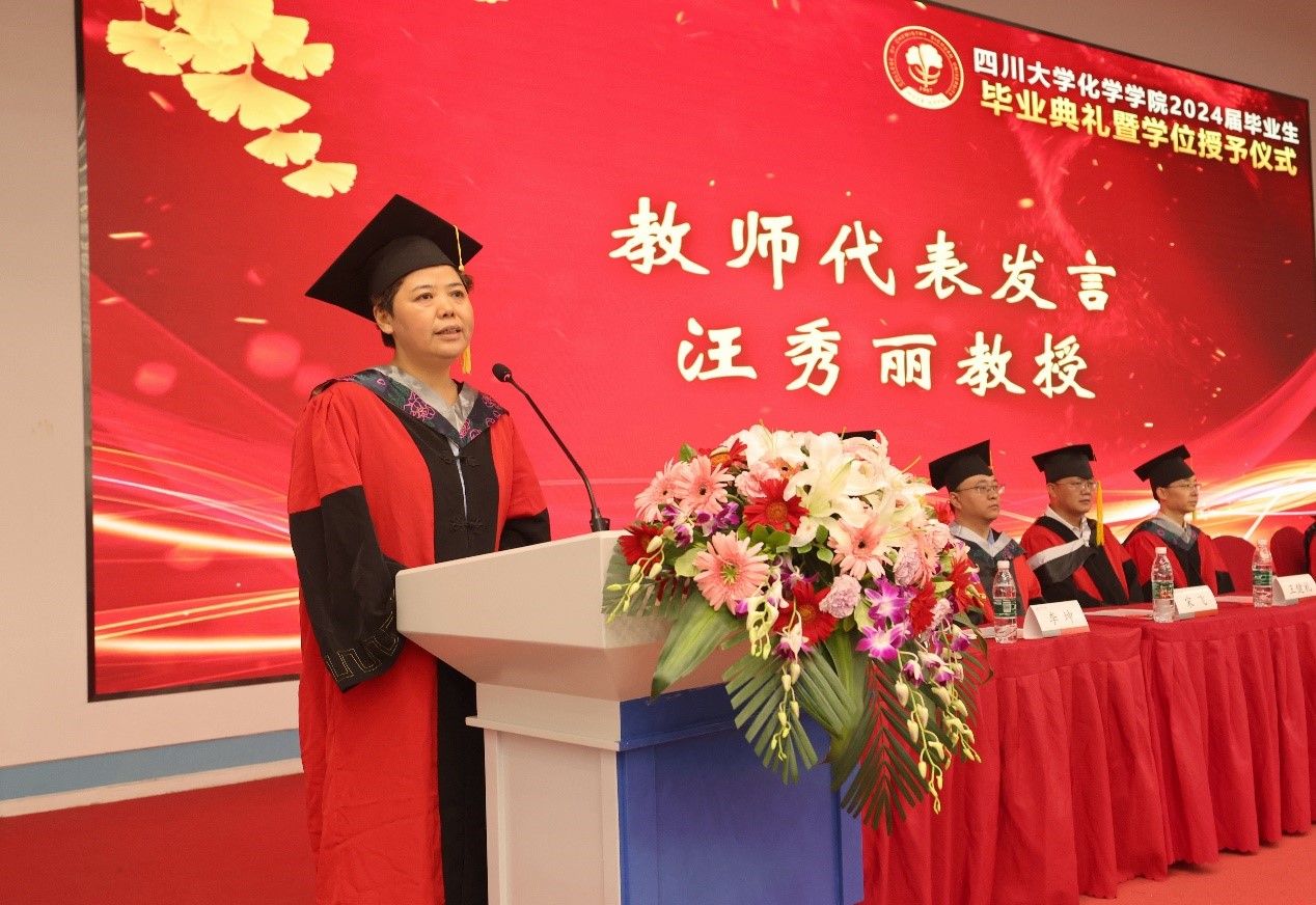 汪秀丽教授作为教师代表发言,表达了对同学们的祝贺,并寄语同学们:在未来的日子里,保持学习的热情,坚守初心、勇于担当,怀揣善良与感恩,回馈社会和国家。