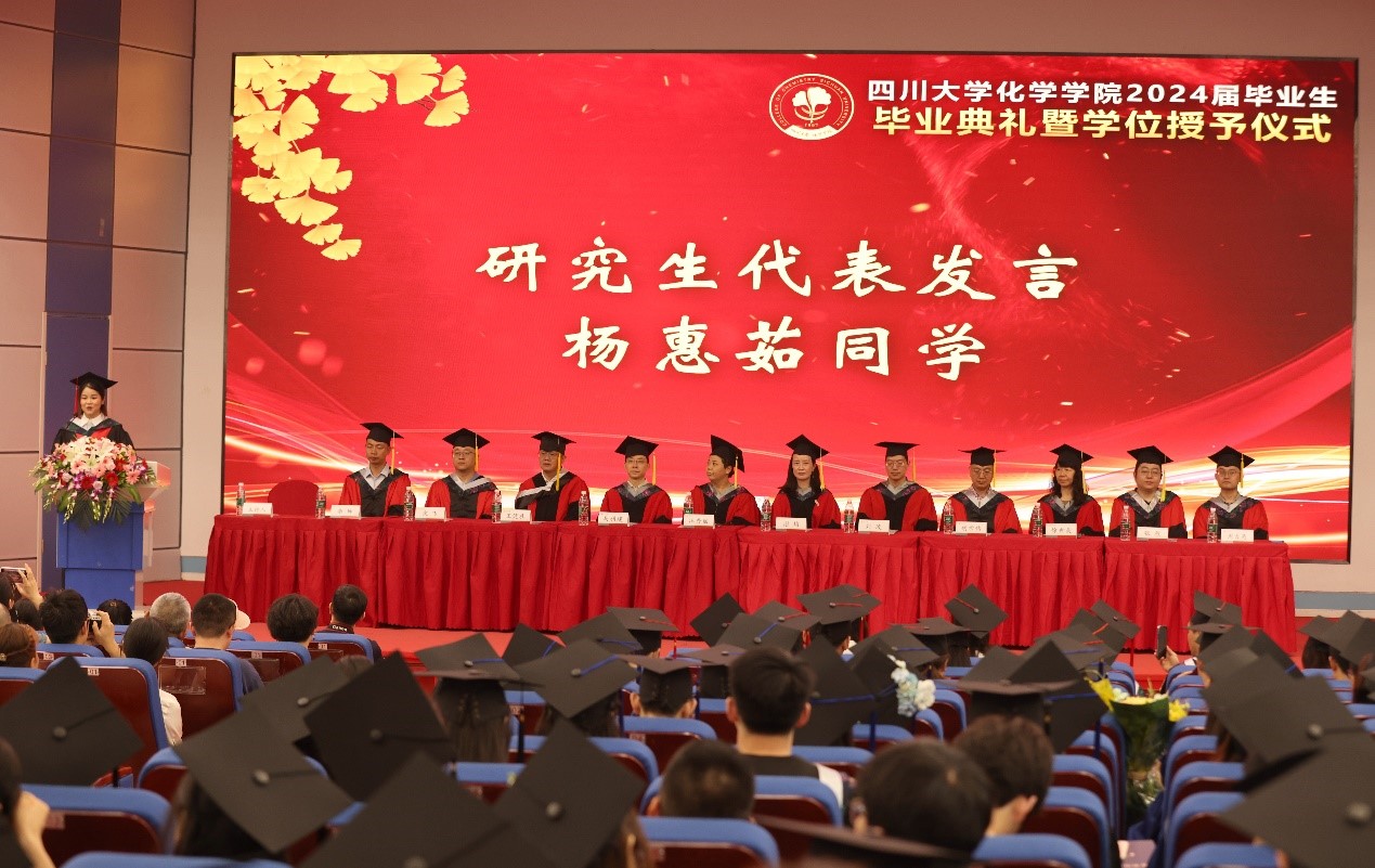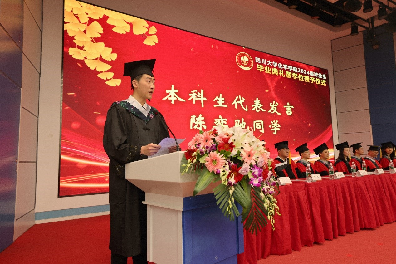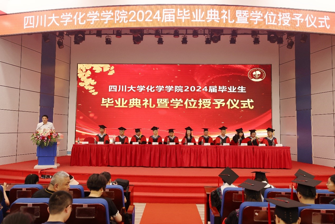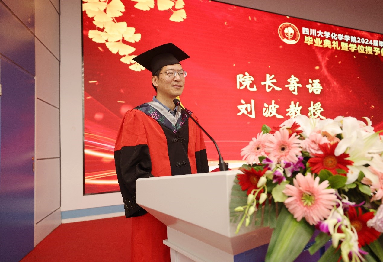 伴随着铿锵有力、雄壮激昂的国歌声,毕业典礼正式拉开帷幕。刘波教授代表学院向2024届毕业生表达了衷心的祝贺和美好的祝愿,希望同学们在形势复杂多变的背景下,一是要坚守初心,追逐梦想;二是要保持斗志,脚踏实地。要坚定自己的初心与理想,重拾自己的激情,涵养宏大格局、树立家国情怀、强化责任担当。心中有梦、不断奋进,保持川大化院人应有的人生态度。学院始终以同学们的成长和成就为荣,无论身处何地,学院永远是大家温暖的家。