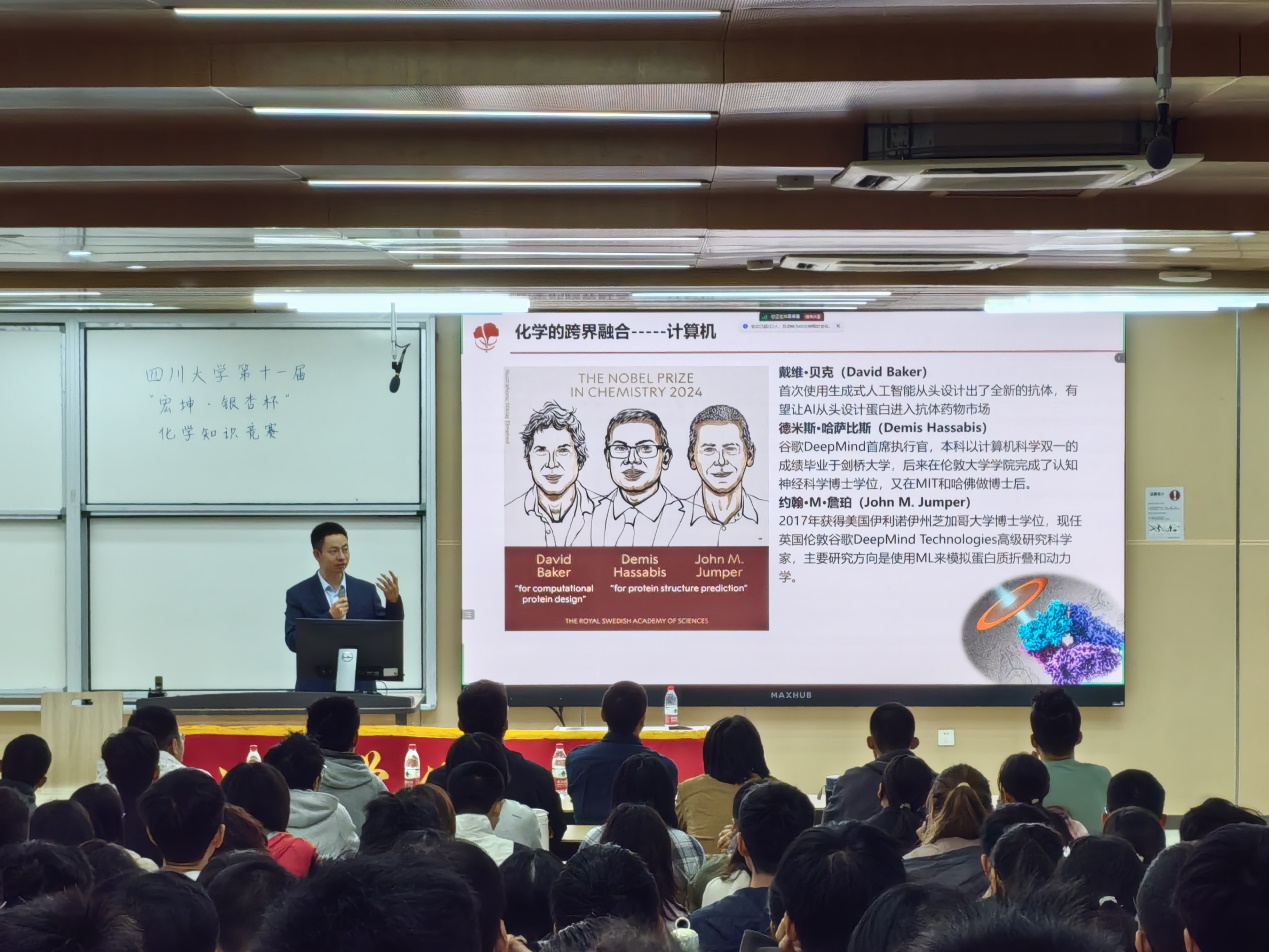 副院长李坤老师为同学们开展“宏坤·银杏杯”化学知识讲座,他讲解了化学与其他学科之间的紧密联系,列举了近些年诺贝尔化学奖及研究领域,并介绍了a漫