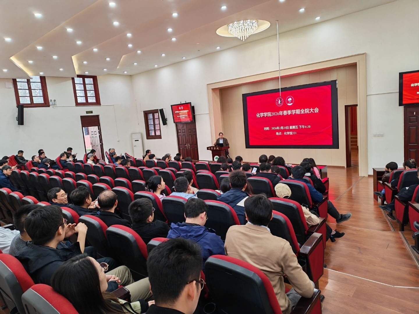 2026 年春季新学期全院大会在望江校区化学馆 321 会议室召开,学院全体教职工参会,会议由院长吕弋主持。