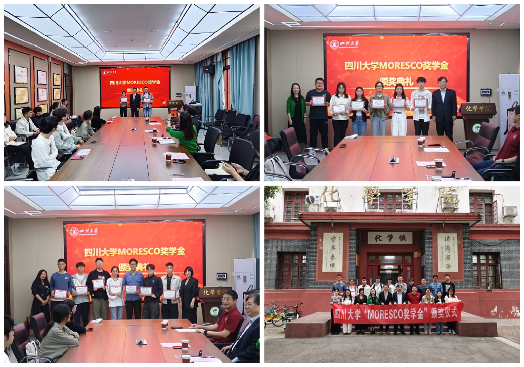 MORESCO奖学金颁奖典礼在化学馆122会议室顺利举行。株式会社MATSUKEN原社长大村洋一先生,株式会社MORESCO执行役员、莫莱斯柯贸易(浙江)有限公司、莫莱斯柯(浙江)功能材料有限公司董事长刘英进校友,莫莱斯柯中国研发中心经理杨帆校友,a漫
