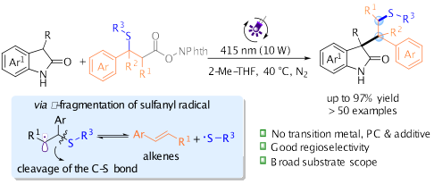8.Cong Lu, Rui Chen, Rui Wang, Dong Jing and Ke Zheng* “Synthesis of sulfur-containing oxindoles by photoinduced alkene difunctionalization via sulfur 1,2-relocation” Org. Lett. 2023, 25, 5, 750–755