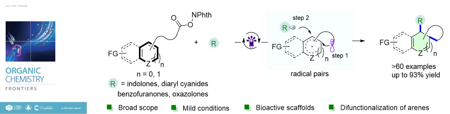 2.Ning Lei, Qian Zhang, Pan Tao, Cong Lu, Qian Lei and Ke Zheng* “Dearomative difunctionalization of arenes via highly selective radical relay reactions” Org. Chem. Front., 2024, DOI: 10.1039/d4qo00964a(封面文章)