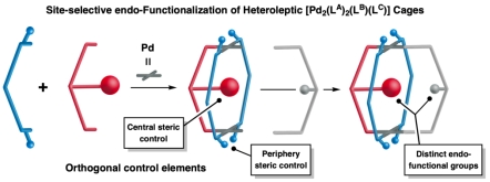 针对上述问题,课题组首先以合成杂配体金属有机超分子笼为策略来构建低对性的仿生受体分子在此基础上,利用官能化的配体分子在超分子笼的空腔内准确地引入功能单元和结构单元。这种策略不仅能在分子尺度上实现限域空间的精准功能化,还有望通过简单的官能团替换操作实现限域空间的高效衍生化,为人工受体和仿生催化剂的合成提供一种具有一定普适性的新方案。