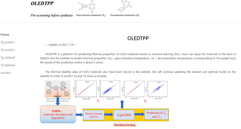 16. Yihuan Zhao, Caixia Fu, Ling Fu, Yijing Liu, Zhiyun Lu**, Xuemei Pu*, Data-driven machine learning models for quick prediction of thermal stability properties of OLED Materials, Materials Today Chemistry, 2021, 22, 100625.