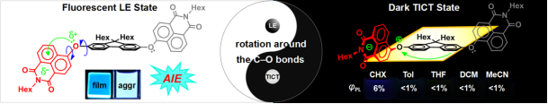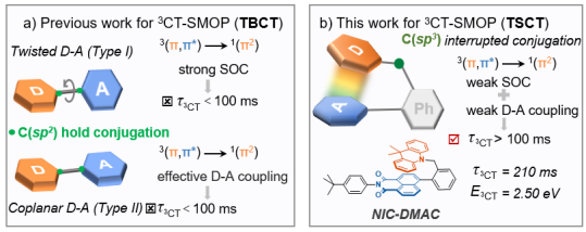1. 提出以“面包夹”型纯有机空间电荷转移分子来获得长寿命、高能量的电荷转移三重激发态