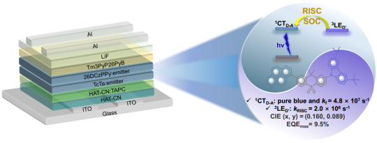 4. 构建出了首例具有紫外发射能力的热激活延迟荧光电致发光材料