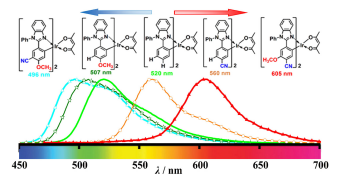 18.Yan Jiao, Ming Li, Ning Wang, Tao Lu, Liang Zhou,* Yan Huang, Zhiyun Lu,* Daibing Luo, Xuemei Pu.* A facile color-tuning strategy for constructing a library of Ir(III) complexes with fine-tuned phosphorescence from bluish green to red using a synergetic substituent effect of –OCH3 and –CN at only the C-ring of C^N ligand, J. Mater. Chem. C, 4, 4269-4277, 2016.