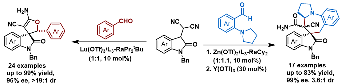 31.Dong, P.; Li, Z. J.; Liu, X. H.; Dong, S. X.*; Feng, X. M.* Asymmetric Synthesis of Polycyclic Spiroindolines via the Dy-catalyzed Cascade Reaction of 3-(2-Isocyanoethyl)indoles with Aziridines. Org. Chem. Front. 2022, 9, 4591.