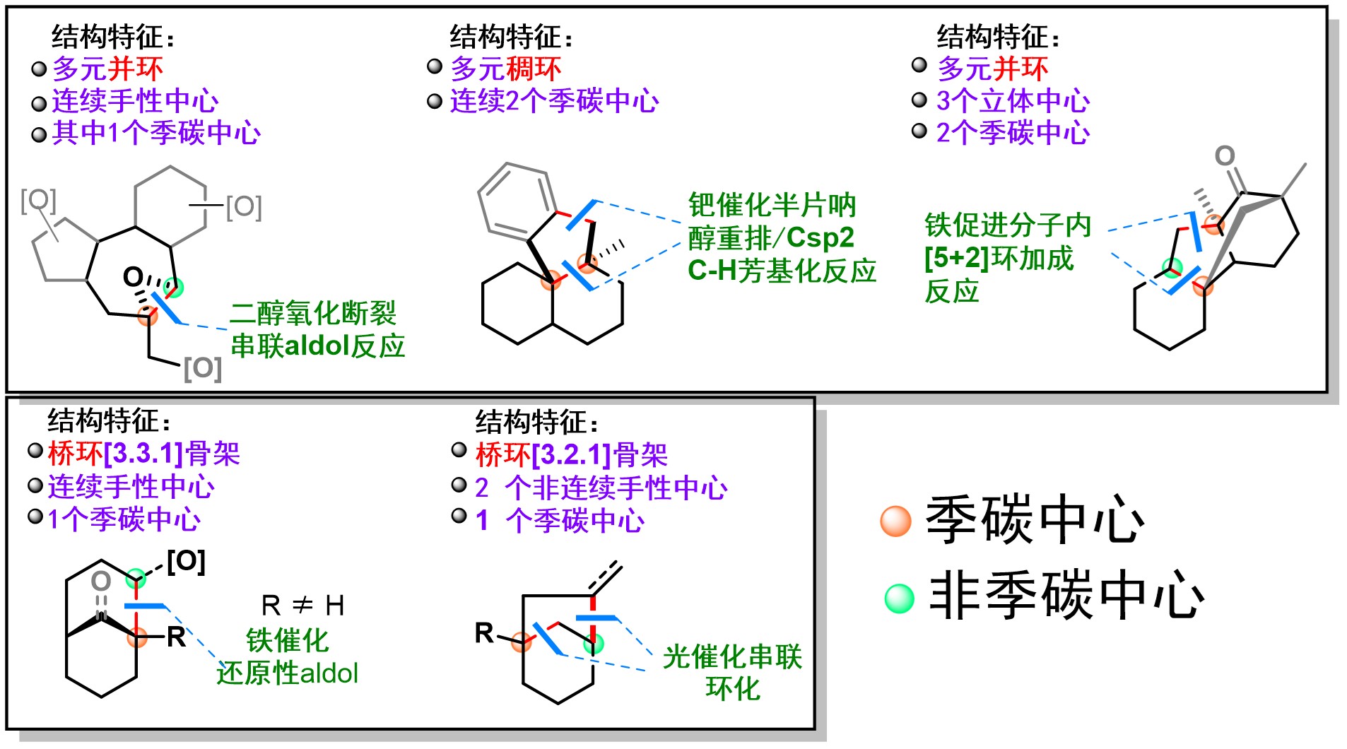 研究兴趣主要以多环骨架结构为研究对象,针对性开发高效合成策略,拓展其在复杂分子合成中的应用(图1)。针对含季碳中心的不同桥环骨架,创新性地发展了光催化烯醇硅醚的串联反应以及铁催化还原aldol反应。针对含季碳中心的不同并环骨架,发展了钯催化半片呐醇重排串联Csp2-H芳基化反应,二醇氧化断裂串联aldol反应以及铁促进[5+2]环加成反应。并以此实现了C20氧化对映贝壳杉烷二萜sculponin U和丁香烷倍半萜rumphellclovane E的全合成以及数个天然产物核心骨架的构建。建立了光催化烯醇硅醚的串联反应合成桥环和稠环骨架的方法学。开发了反常区域选择性的铁催化γ/δ-烯基烯酮串联环化反应合成双环环丙醇的策略。累计发表论文 53篇,它引超过 1400 次,其中以第一(共同)或者共同通讯作者发表论文35篇,包括 J. Am. Chem. Soc. 发表 2 篇,Angew. Chem. Int. Ed. 发表 2 篇,Org. Lett. 8篇,Chem. Comm. 1篇,OCF 3篇,JOC 2篇;两篇论文入选ESI高被引论文,2篇论文引用超过200次,最高它引超过280次。