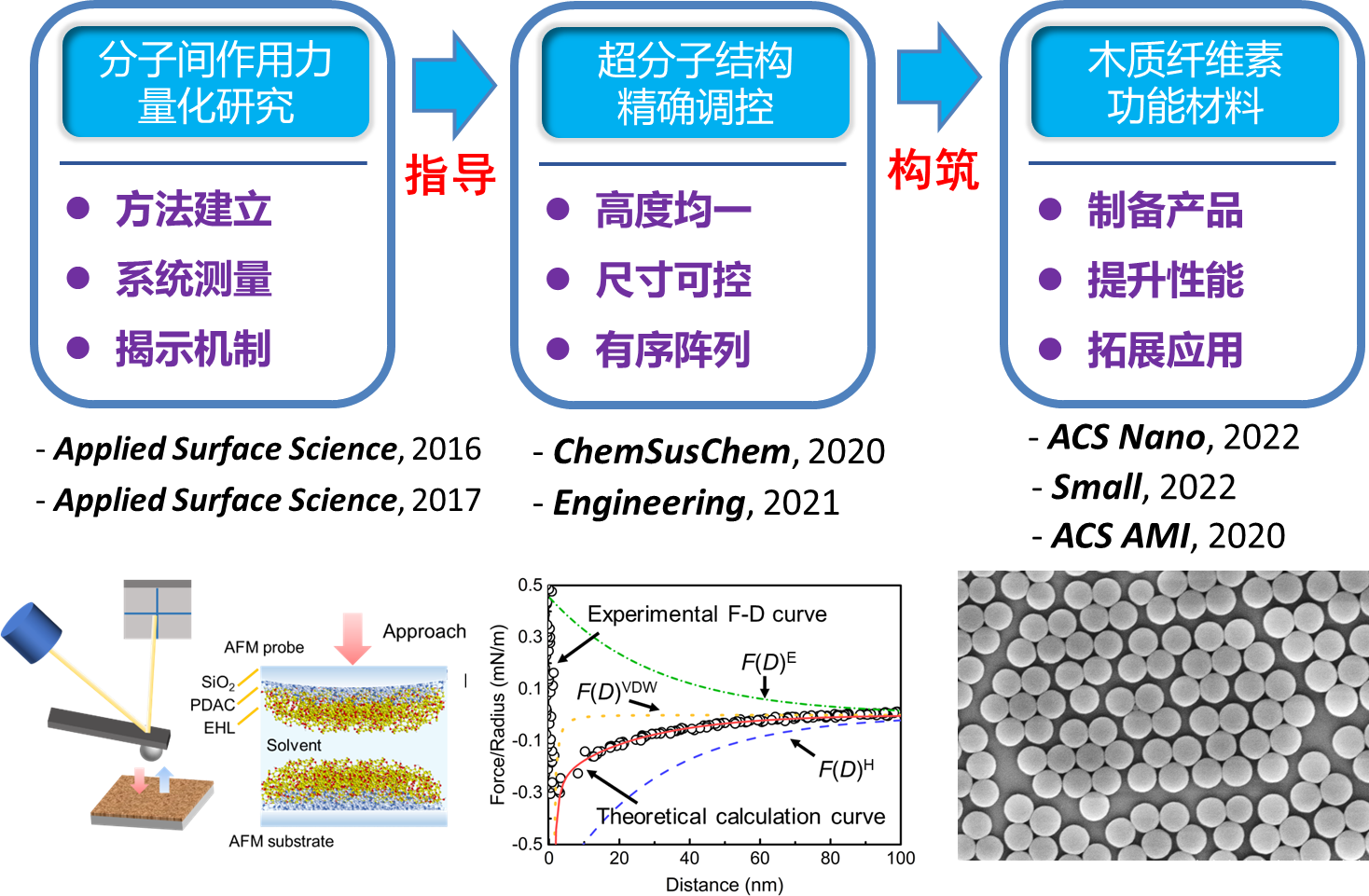 生物质资源具有储量丰富、绿色环保、可再生等优点,具有极高的利用价值。将生物质资源转化为液体燃料、平台化学品和生物基材料,是替代石化资源的重要思路和途径,对全球的可持续发展战略具有重要意义。本人一直从事木质纤维素类生物质的高值化利用和相关基础研究,主要通过对木质纤维素分子间相互作用进行定量化研究,揭示木质素超分子组装过程中的分子间作用机制,对其超分子结构进行精确调控,从而制备木质纤维素功能化材料,并探索其在光子材料等领域的应用。本人在上述研究中取得了一系列成果,包括发表 SCI 论文共计20余篇,其中以第一作者/通讯作者在ACS Nano, Small, Engineering, Green Chemistry, ACS Applied Materials & Interfaces,Chemical Engineering Journal等国际权威SCI期刊发表论文共计10篇,授权国家发明专利1项,并获得国家自然科学基金青年基金等项目的支持。