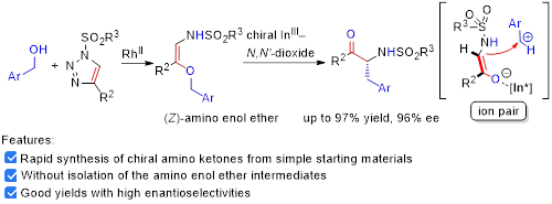 在非手性铑盐和手性双氮氧-铟配合物存在下,不同取代的三氮唑可与多种类型的苯甲醇类底物发生反应,较高收率和高对映选择性地得到一系列a-氨基酮产物,最优结果高达97%的收率和96%的对映选择性。通过产物单晶、控制实验以及动力学研究,我们认为该重排反应经历了离子对机理。
