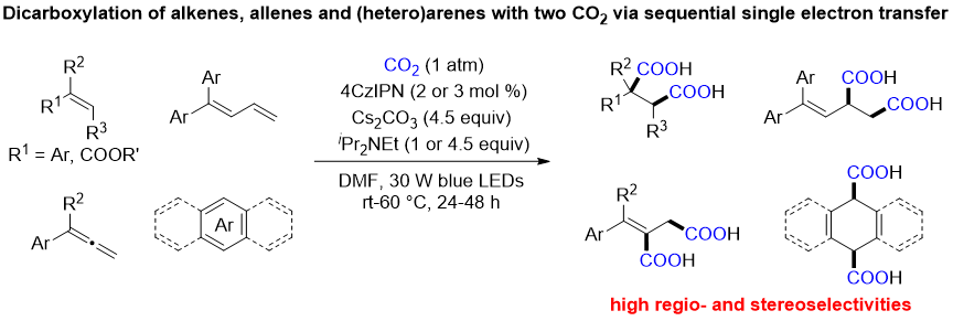 该研究成果于2021年4月15日在Nature Catalysis期刊在线发表,题目为“Dicarboxylation of alkenes, allenes, and (hetero)arenes with CO2 via visible-light photoredox catalysis” (文章链接://www.nature.com/articles/s41929-021-00594-1)。a漫