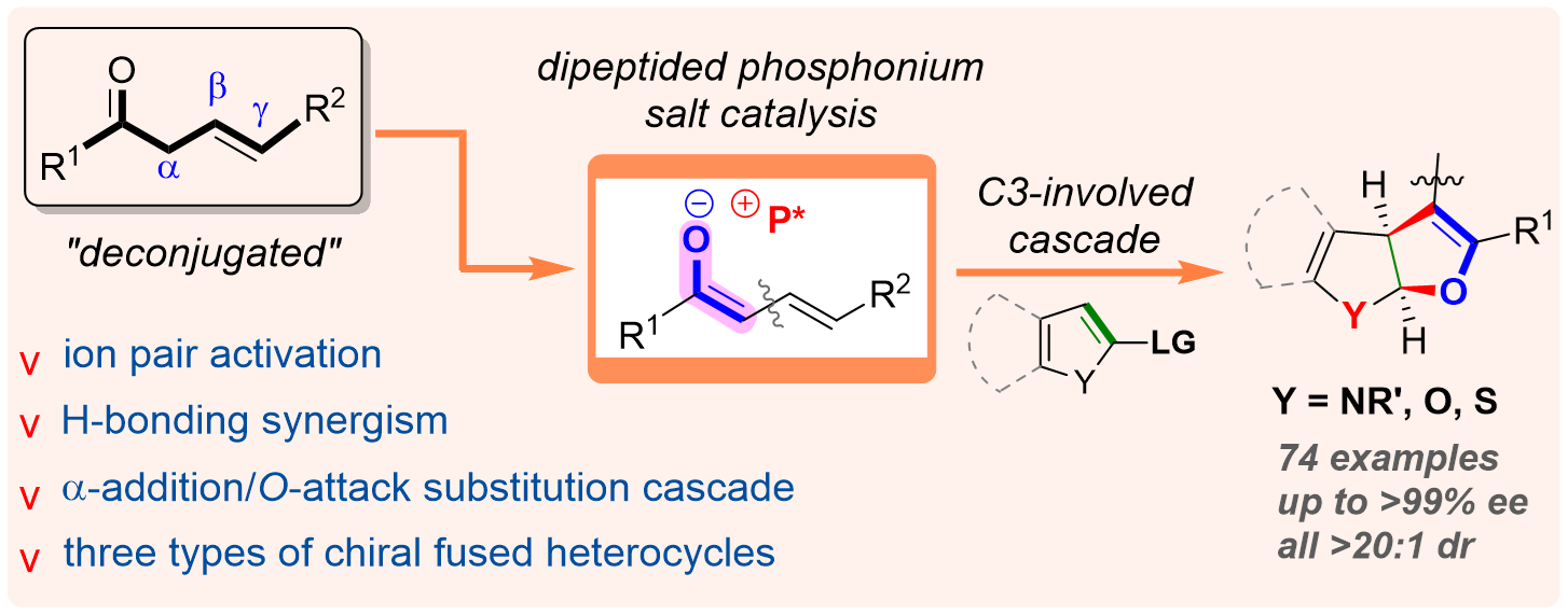 王天利教授课题组一直致力于手性肽-季鏻盐催化的不对称合成化学研究,开发了一系列新型高效的多功能手性肽-季鏻盐催化剂、及其催化的新合成方法学。针对上述科学挑战,该团队利用二肽-季鏻盐作为手性催化剂,首次实现了b, g-不饱和酮作为一类新型C3-合成子参与的不对称串联反应,高效高选择性地构建了三类二氢呋喃并[2,3-b]杂环化合物。