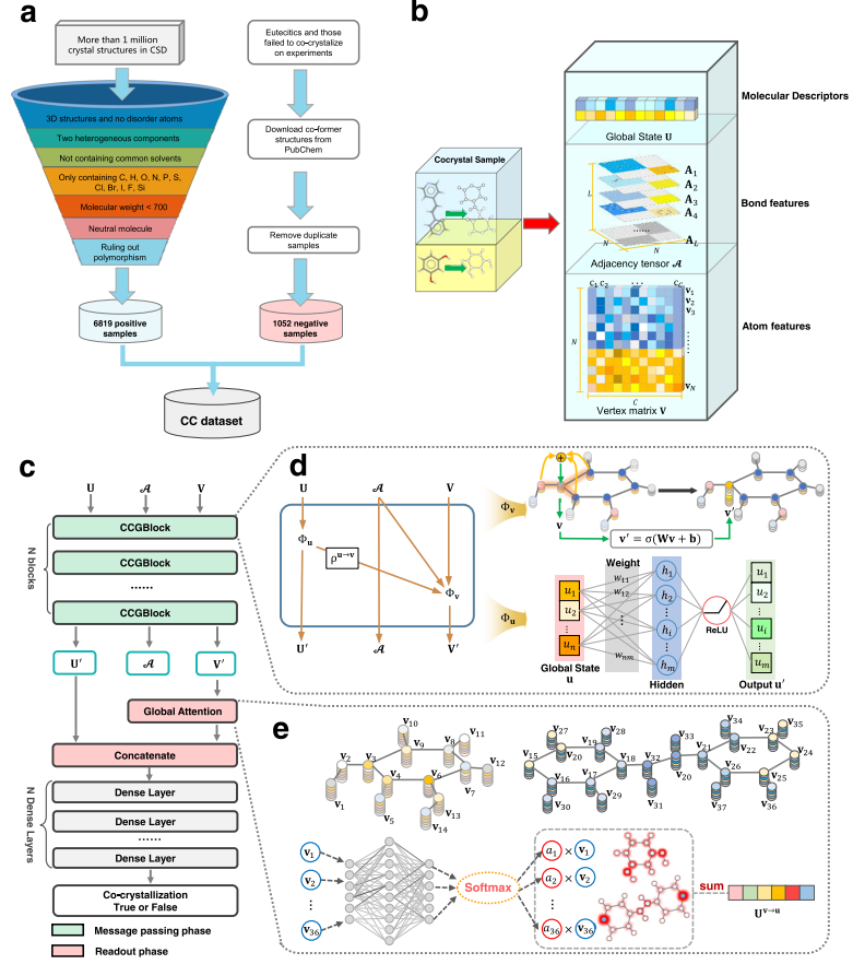 作者针对此挑战,通过在图神经网络的end-to-end的自我学习中嵌入共晶形成的先验知识,并通过结合数据增强、注意力机制、集成学习和迁移学习的策略成功开发了一款针对有限且不均衡数据分布的共晶样本的图神经网络框架的筛选模型CCGNet(Co-crystal Graph Net),准确度高普适性强,有效克服了共晶样本数据有限和不均衡的困难,预测准确度明显高于7个竞争性模型(3个传统机器学习和4个深度学习模型),实验验证进一步证实了其在实际中的应用潜力,有望成为共晶实验筛选的有效预测工具。